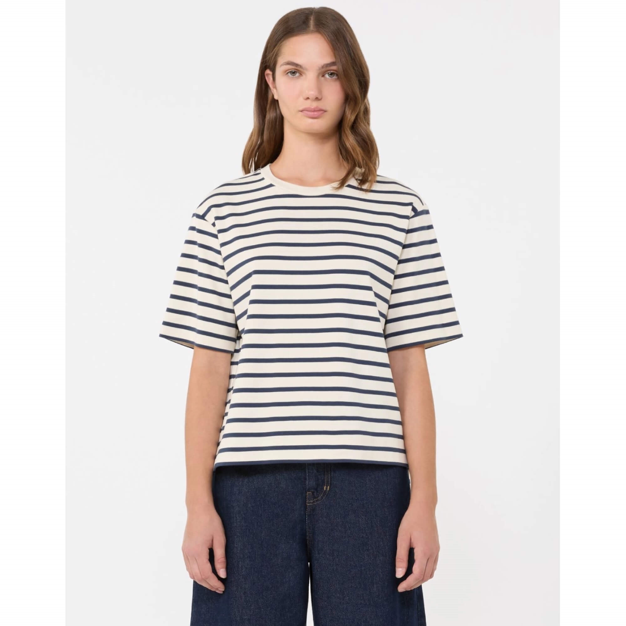 MULTID fra Weekend Max Mara er den skønneste kortærmet basis T-shirt udformet i en lækker og super blød stretch bomuldsjersey. T-shirten er designet med rund halsudskæring og diskret logotryk på bagsiden og en loose fit pasform. Den er ideel at bruge indenunder alle dine favorit items hjemme i garderoben, eller for sig selv under en blazer eller til et par cowboy jeans for et lækkert hverdagslook! Den nye fine Navy Stripe farve er bare en favorit, og lækker uanset sæsonen!