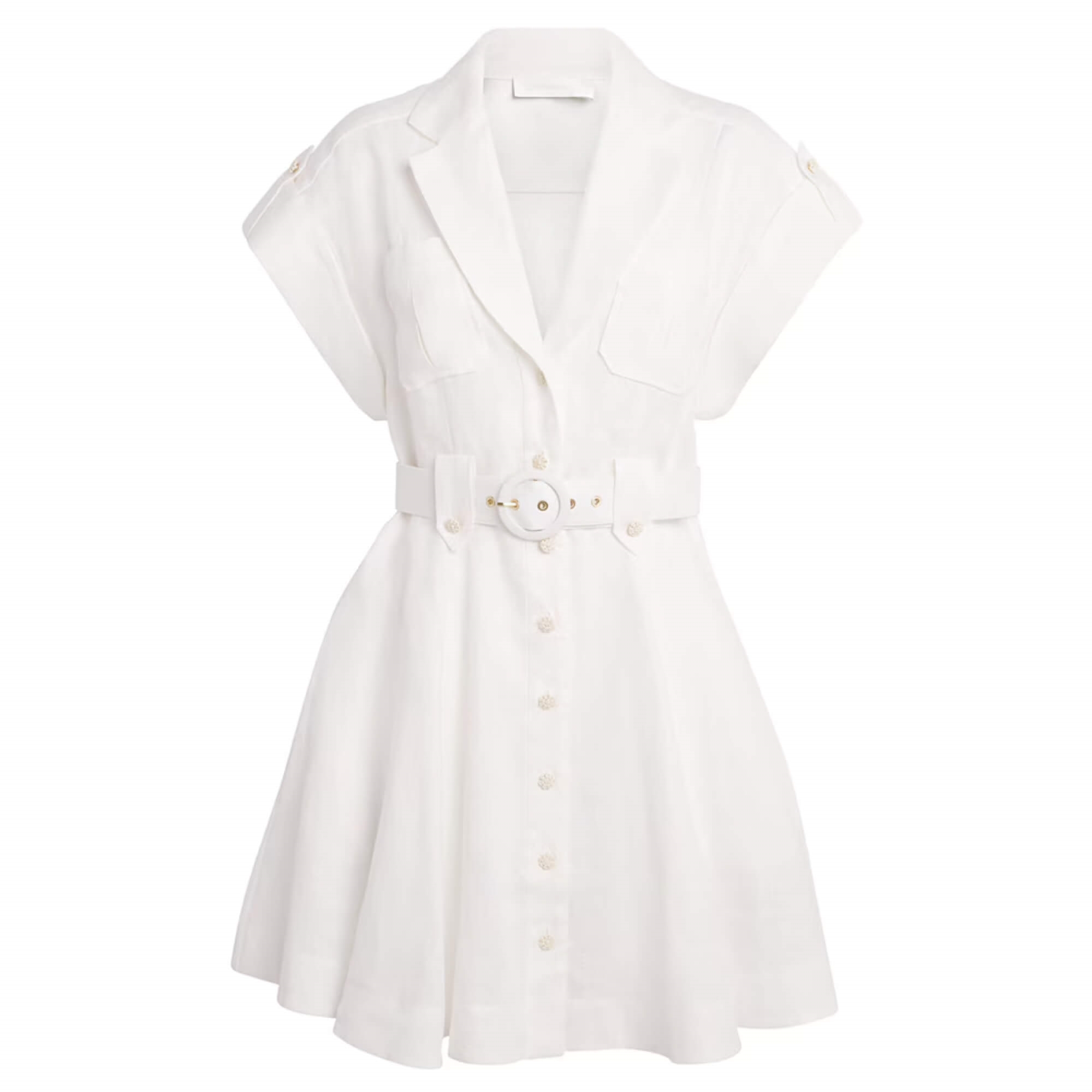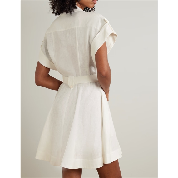 Awaken Mini Shirt Dress fra Zimmermann er en elegant og tidløs skjortekjole i en blød elfenbenshvid nuance, der udstråler ubesværet sommerlig stil. Den er fremstillet i et let, åndbart materiale med en struktureret silhuet, der kombinerer klassisk skrædderi med feminin lethed.